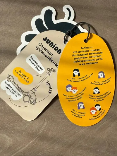 Недавно #juniorcreator получила в подарок самокат Junion, а там вот такая милая бирка с перечислением команды и вклада каждого в разработку продуктов бренда. Классно!