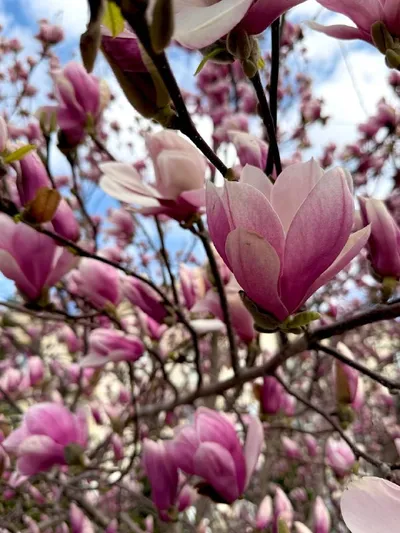 Знаменитая магнолия Суланжа на Большой Морской в Севастополе ❗️сейчас на пике цветения. 🌸 Невысокое дерево полностью покрыто крупными цветами. 🌸 Уже через неделю лепестки начнут вянуть и опадать.