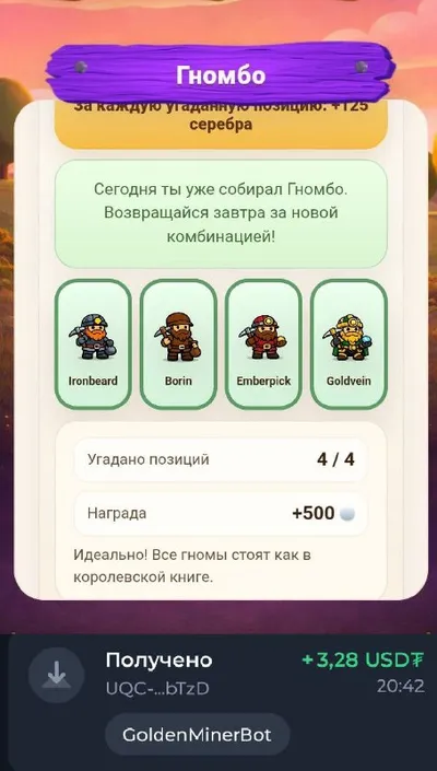 Golden Miner - комбо и первый вывод! Вводим последовательность на фото и забираем 500 серебра🤑 Вчера успешно протестировал первый вывод средств. Всё работает идеально: деньги приходят за считаные