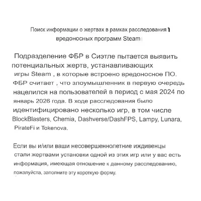 🔍 ФБР взялось за скамеров в Steam Федералы открыли охоту за криптоскаммерами, залившими зараженные игры в Steam 🔍 Под подозрение попали проекты: BlockBlasters (историю с ней помним), Chemia, Dashv