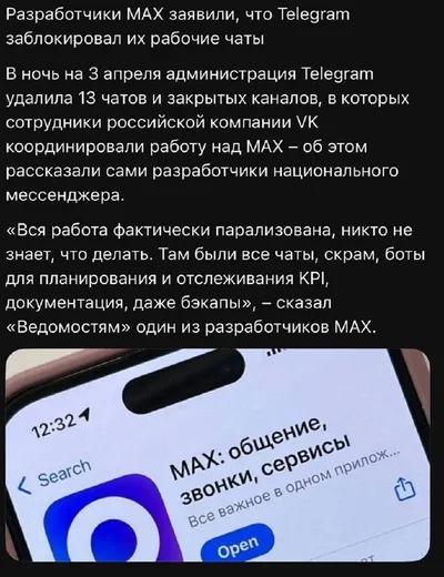 🎁 Туда их! Дуров наносит ответный удар Максу — Пашка удалил рабочие чаты и каналы у команды MAX (новость от ИА панорама, мб шутки шутят) Самое ироничное, что у сотрудников MAX рабочий процесс был