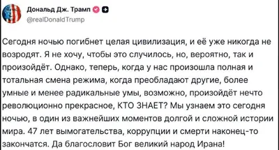😮 «Сегодня ночью погибнет целая цивилизация», — Трамп — Рыжий совсем обезумел, либо опять пугает, либо… Пожалуйста, дайте ему кто-нибудь какие-нибудь таблетки.. 🐳 дайте ему таблеток Чат • Купит