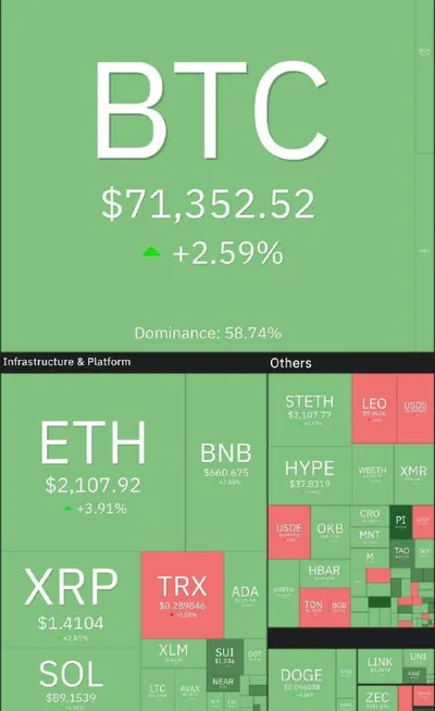 ☕️ Утренний обзор рынка 🪙 Биткоин вырос выше $71 000 ⚪️ Эфир — выше $2 100 🔸 BNB — 660$ Альты из топ-100 также подрастают. Индекс страха и жадности — 15 Похоже перед выходными закрепимся на этих