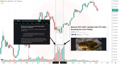 Знаете ли вы, почему дно медвежьего рынка #BTC в 2022-2023 годах выглядело как огромные объемы? (на Binance) 👉 Только потому, что Binance ввела торговлю с нулевой комиссией для спотовой торговли #