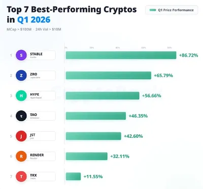 Из почти 200 топовых криптовалют за первый квартал 2026 года существенный рост показали единицы. Вот топ-7 от CryptoRank.