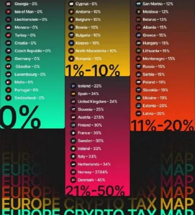 Налогообложение доходов от криптовалюты в Европе: • Грузия: 0% • Остров Мэн: 0% • Лихтенштейн: 0% • Монако: 0% • Турция: 0% • Хорватия: 0% • Чехия: 0% • Германия: 0% • Гибралтар: 0%