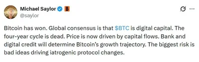 🔮Майкл Сэйлор заявил, что четырехлетний цикл BTC мертв: «BTC победил. Глобальный консенсус заключается в том, что BTC — это цифровой капитал. Теперь цена определяется потоками капитала. Траекторию