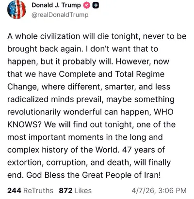 🇺🇸Трамп: Сегодня ночью погибнет целая цивилизация, и её уже никогда не вернуть Я не хочу, чтобы это произошло, но, скорее всего, так и будет. Однако теперь, когда произошла полная и тотальная сме