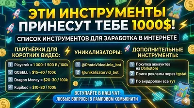 Эти Инструменты принесут тебе 1000$! Собрал для вас весь список инструментов, которые упростят ваш заработок в интернете Партнёрки для коротких видео: 1️⃣Playerok ≈ 1 000–1 500 ₽ / 100k просмотров