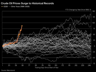 🛢 Динамика цен на нефть с начала календарного года в процентах. Данные с 1986 по 2026 (выделен оранжевым). ➡️ Не зря мы регулярно отсылаем всех к опыту нефтяного эмбарго 1973-1974 годов. С тех пор н