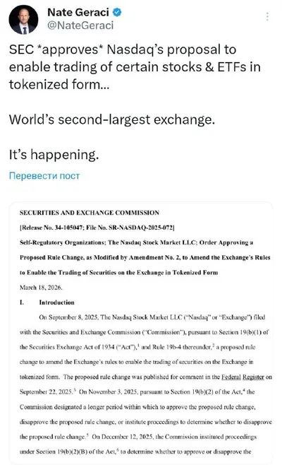 ⚡️ Комиссия по ценным бумагам и биржам (SEC) одобрила предложение Nasdaq разрешить торговлю отдельными акциями и ETF в токенизированной форме. Вторая по величине биржа в мире. Это происходит. ⭐️ -