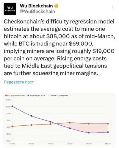 🤔 Согласно модели регрессии сложности майнинга от Checkonchain, средняя себестоимость добычи одного биткоина на середину марта оценивается примерно в 88 000 долларов, в то время как курс BTC составля