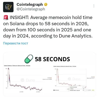 🔞 По данным Dune Analytics, средняя продолжительность секса удержания мемкоинов в сети Solana в 2026 году сократится до 58 секунд (по сравнению со 100 секундами в 2025 году и одним днём в 2024 году).