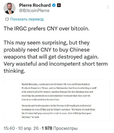 🔫 Корпус стражей Исламской революции, похоже, предпочитает получать за прохождение Ормузского пролива плату в китайских юанях, а не в биткоинах. Это может показаться удивительным, но, вероятно, им н