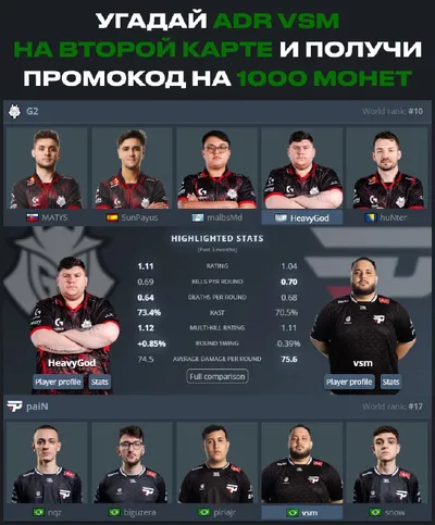 💰 Первый, кто угадает ADR игрока vsm на второй карте против G2 - получит промокод на 1.000 монет. Спеши написать свой вариант в комментариях. Отыгрыш на промо х3. Отредактированные комментарии не бу