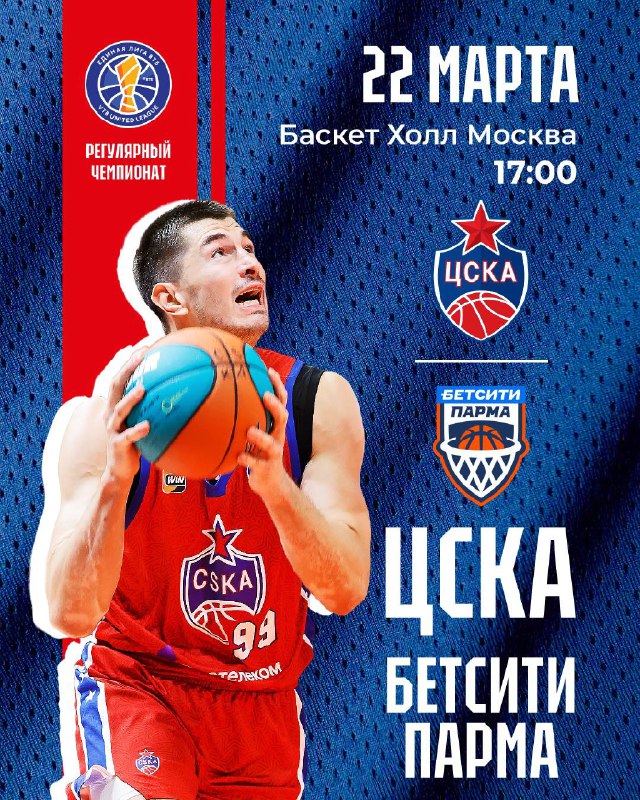 🎟 Билеты на матч ЦСКА — «Бетсити Парма» уже в продаже! 🗓️ 22 марта встречаемся в «Баскет Холле Москва». Начало игры в 17:00. ❤️💙 Ждём вас на трибунах, чтобы вместе поддержать команду в домашнем м