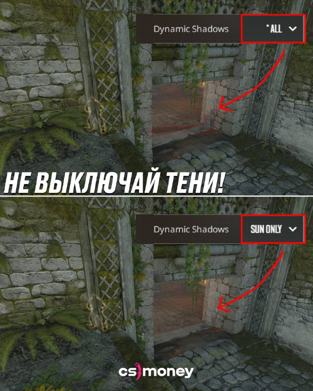 Твой легальный WH в CS2, которым ты почему-то не пользуешься 👀👀👀 Разница между динамическими тенями = разница между фрагом и смертью. 👉 «All» - заранее видишь тень противника за углом 👉 «Sun Onl