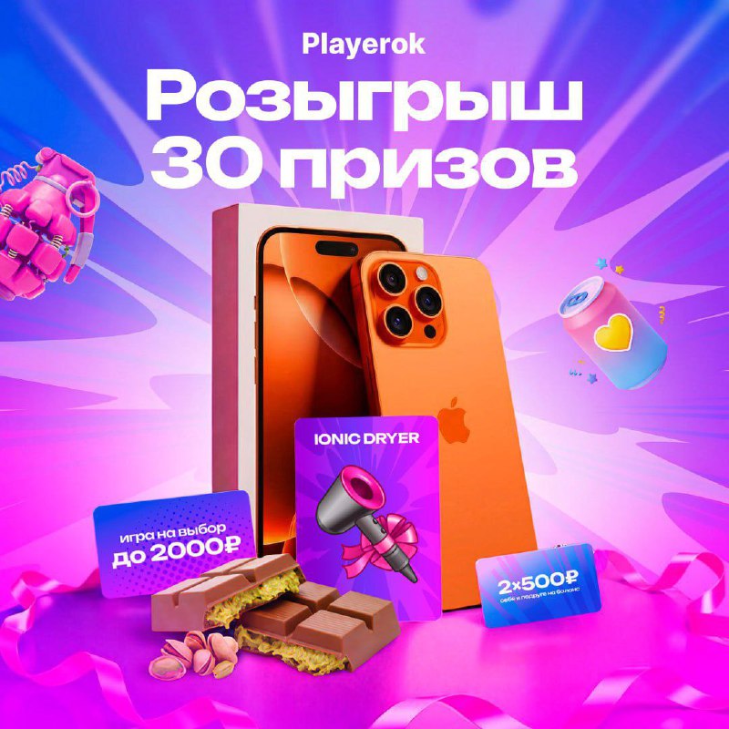 ПРЕКРАСНЫЙ РОЗЫГРЫШ ОТ PLAYEROK 💜 Список призов: 1 место — iPhone 17 Pro 📱 2-4 место — NFT Ionic Dryer 💨 5 место — Дубайская шоколадка 6-10 место — Любая игра до 2 000 ₽ на выбор 11-30 место — 2×