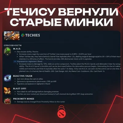 😳 ЗЕЛЕНЫЕ МИНКИ ВЕРНУЛИСЬ — Valve вернули Течису удаленные мины, правда в немного другом виде При смерти Techies оставляют бочку, которая взрывается через 1.5 сек., нанося магический урон, равный 50
