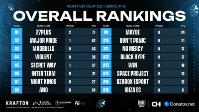 МАТЧИ ГРУППЫ В ПОДОШЛИ К КОНЦУ! 🐰 Поздравляем 27plus, Major Pride, MadBulls, VIOLENT и SECRET WAY с проходом в плей-офф! 🎉 ⚠️ Команда No Mercy лишается очков за последнюю карту в связи с нарушение