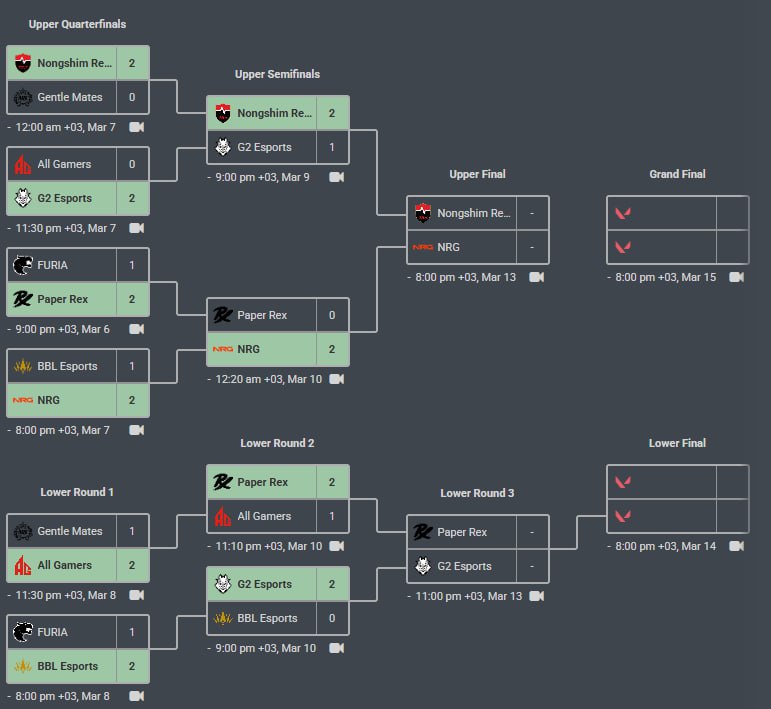 Прх закрывают 2-1 и вот такая ситуация у нас по матчам NS vs NRG в пятницу за проход в гранд-финал. PRX vs G2 так же в пятницу за выживание на турнире и проход в нижний финал против NS/NRG