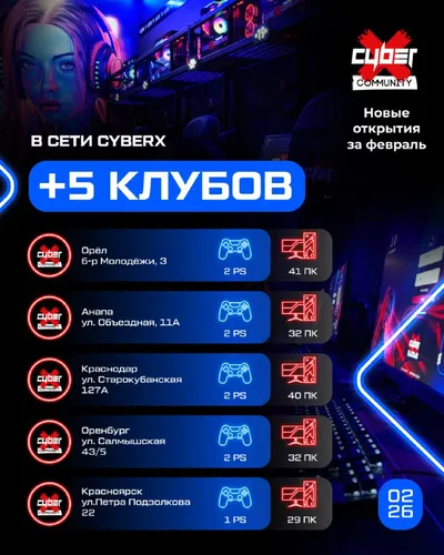 📈+5 новых клубов в сети CyberX Community В феврале ещё пять клубов запущены по франшизе CyberX в разных городах России 🔥 Новые клубы CyberX: — Орёл, б-р Молодёжи, 3 — Анапа, ул. Объездная, 11А