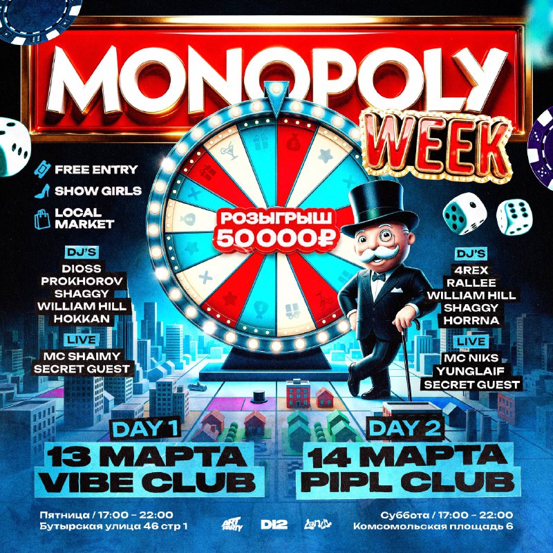 DATE: 13 – 14 марта, пятница – суббота LOCATION: VIBE – PIPL CLUB Врываемся в весну с яркой тусовкой и большими призами! Приготовьтесь переместиться на игровую доску и погрузиться в мир азарта, где к