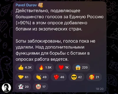 Павел Дуров начал блокировать ботов, используемых для накрутки в опросах 😘