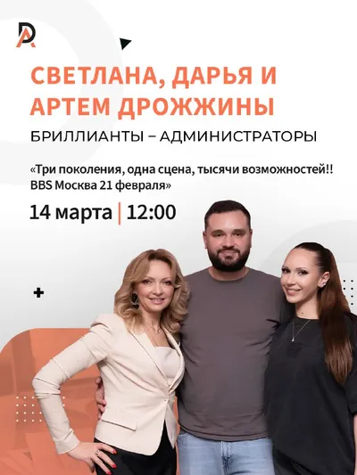 📣 Эфир на dalife.ru ⠀ 🗓 14 марта ⏰ 12:00 Спикеры: Светлана, Дарья и Артем Дрожжины Уровень: Бриллианты – Администраторы Тема: «Три поколения, одна сцена, тысячи возможностей!! BBS Москва 21 февра
