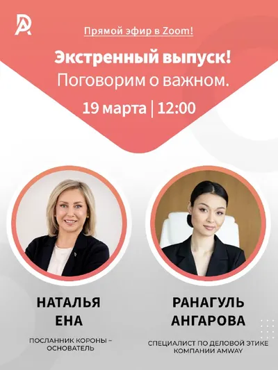 🛜 Прямой эфир в Zoom! 🗓 19 марта ⏰ 12:00 Спикеры: 🟢 Наталья Ена | Посланник Короны – Основатель 🟢 Ранагуль Ангарова | Специалист по деловой этике компании Amway Тема: «Экстренный выпуск! Пог