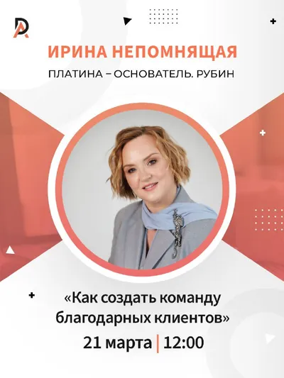 📣 Эфир на dalife.ru ⠀ 🗓 21 марта ⏰ 12:00 Спикер: Ирина Непомнящая Уровень: Платина – Основатель. Рубин Тема: «Как создать команду благодарных клиентов» Экономическое образование, в прошлом опыт