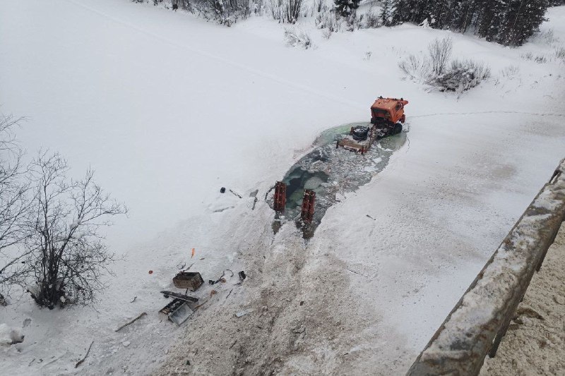 КАМАЗ с прицепом провалился под лед в Ухте! Водитель большегруза не справился с управлением, протаранил ограждение и «слетел» с дороги в реку. Предварительно установлено, мужчина 1974 года рождения