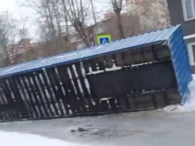 Уронил контейнер. Контейнер сорвался с полуприцепа грузовика и опрокинулся на бок на в Ленинском районе Новосибирска. Синий контейнер рухнул на пешеходный переход и полностью перекрыл движение по д