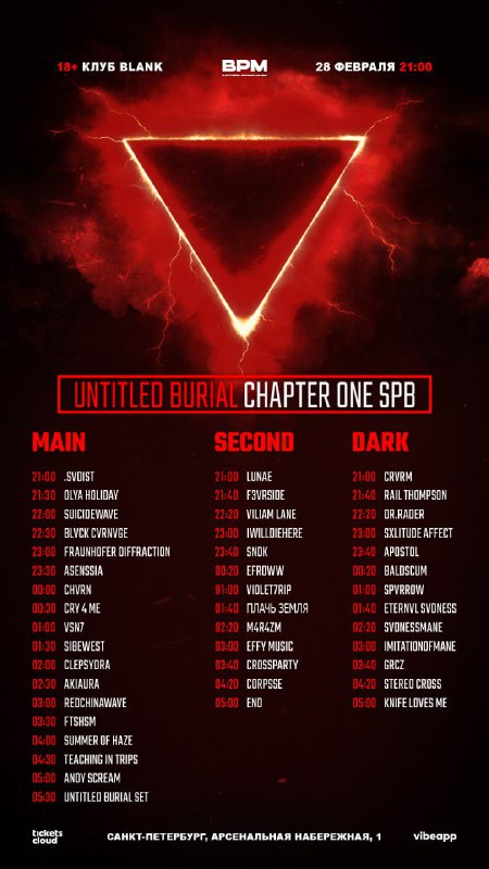 Сегодня в Бланке состоится Масштабный Витч-Хаус фестиваль Untitled Burial: Chapter One 🖤 Ловите расписание этой ночи • Встреча в VK / Канал в telegram • Плейлист с музыкой всех артистов • Информац