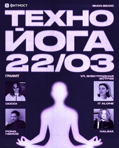 Техно йога l Графит, вс 22.3 Глубокое размеренное дыхание и плавные движения тела под мощные и ритмичные биты техно 18:00-18:50 хатха под диджей-сет от odddi 19:00-19:50 виньяса под диджей-сет от Р