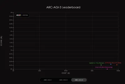 ARC-AGI-3 - бенчмарк,показал неприятную для всей индустрии вещь: даже топовые frontier-модели сейчас набирают меньше 1%. Лучшие результаты на старте такие: - Gemini 3.1 Pro Preview - 0.37% - GPT-5.4