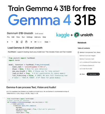 Теперь можно бесплатно дообучать Gemma 4 31B прямо в ноутбуке 🚀 Обучение модели на 31 миллиард параметров полностью бесплатно с использованием Kaggle и Unsloth. GitHub: https://github.com/unslothai