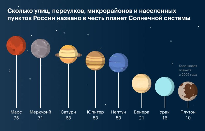 Когда я работал в Т—Ж, мы тоже, кстати, делали инфографику про планеты. Только — в названиях топонимов. Тут уже совсем другая картина! Обратите только внимание, что это другой вид графика — «леденцов