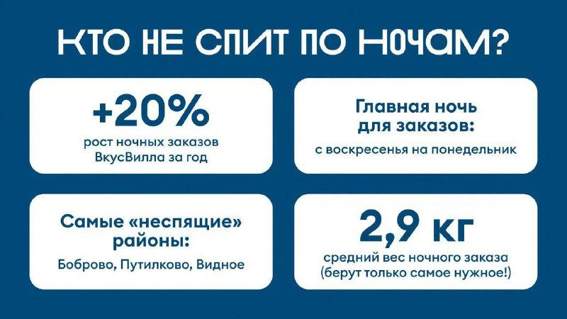 ВкусВилл: Спрос на ночную доставку за год вырос на 20% ВкусВилл сообщил о росте спроса на ночную доставку (с 00:00 до 06:00) за последний год на 20%. Такие заказы круглосуточно собирают 248 дарксторо