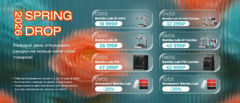 SPRING DROP | специальные цены на Bambu Lab 8 дней! 💚 В мире только начинается весна, а у нас уже распускаются цены 🌸 С 3 по 10 марта открываем новые супер-скидки каждый день 📅 Следи за календа