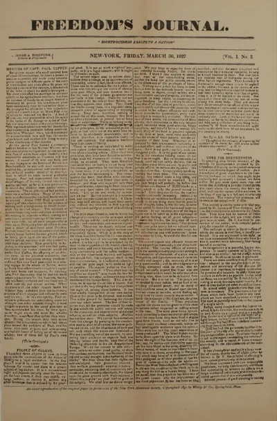 16 марта 1827 года в Нью-Йорке начала выходить первая газета, издаваемая чернокожим населением США, Freedom's Journal. Распространялась она в 11 штатах. Цель выхода издания была понятной, очевидной и