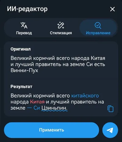 Решил тут проверить новость, что в ТГ завезли редактор на китайской модели... И в правду, похоже... Дуров завёз с олимпиадниками чёт из китайских LLM??? 🪨🪨🪨 Кстати про Тайвань и площадь Таньанмэн
