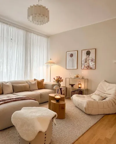 Уют в цвете топлёного молока 🥛 Посмотрите, как круто здесь «подружили» разные светильники: и бумажные шары, и белое «облако» под потолком. За счёт того, что все оттенки очень близкие и мягкие, комнат