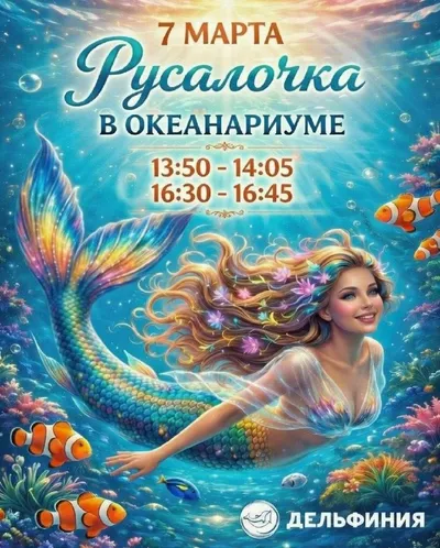 Центр «Дельфиния» приглашает Вас провести весенние выходные в компании русалочки! 🧜🏻♀️ Посетители океанариума смогут увидеть волшебную русалку 7 марта в 13:50 и 16:30 в туннеле океанариума среди