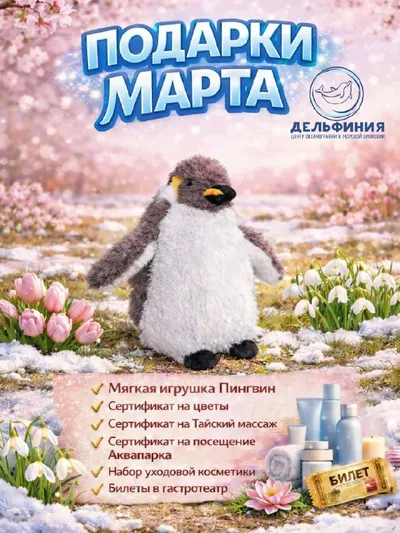 Дорогие гости! 🥰 В марте мы разыгрываем подарки для посетителей нашего Центра! 🤩 🎁 Среди подарков будет: - мягкая игрушка Пингвин от «Дельфинии» - сертификат на покупку цветов от ТЦ «Аура» - с