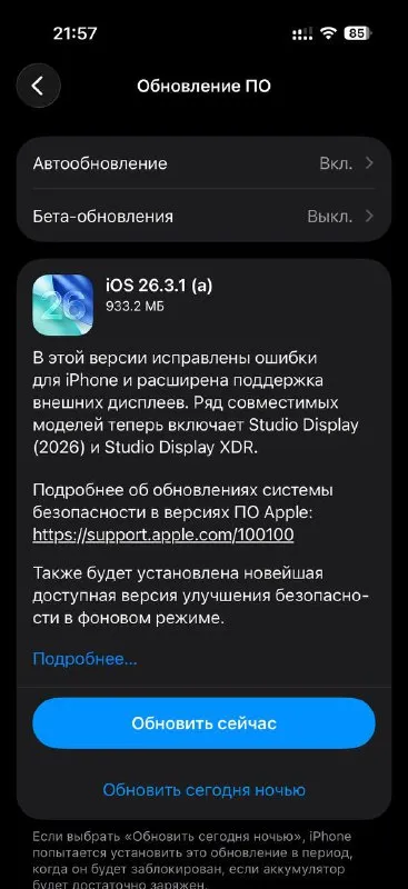 ⚡️Apple выпустила iOS 26.3.1 (a) Это обновление безопасности. Багфиксов и новых фишек внутри нет! ❗️ Если у вас 26.3.1, то найти обновление можно через «Настройки — Конфиденциальность и безопасность