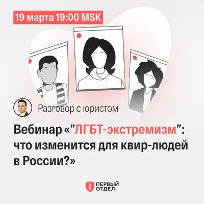Вебинар «“ЛГБТ-экстремизм”: что изменится для квир-людей в России? Разговор с юристом» Этой весной правозащитный проект «Первый отдел» проведет серию вебинаров о правах меньшинств и уязвимых групп. П