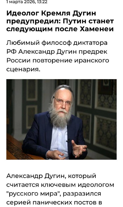 Придворный путинский философ дугин, который годами объяснял, почему россия обязана всех пугать, расширяться и жить в режиме вечного «встанем с колен», вдруг увидел в зеркале Иран и не на шутку испугал