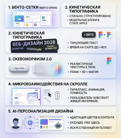 5 трендов веб-дизайна, которые захватят 2026 год Держите подборку главных направлений, которые уже меняют правила игры 👇 1. Бенто-сетки (Bento Grids) Модульные блоки в стиле Apple. Контент разбивае