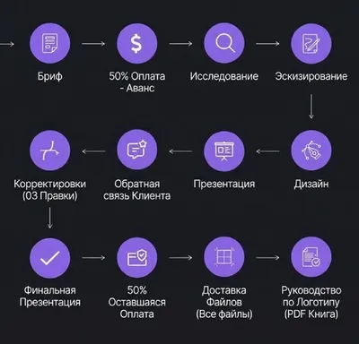 Процесс разработки логотипа в 2026 году Часто спрашивают, как устроена работа над логотипом. Вот пошаговый процесс — прозрачно и без сюрпризов: 1. Бриф — узнаём всё о бизнесе и задачах 2. 50% оплат